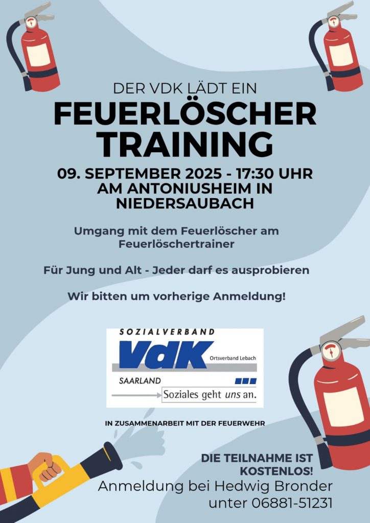 Feuerlöschübung Veröffentlicht am 13. August 2025 von Hachener Der VdK Lebach lädt ein – in Zusammenarbeit mit der Feuerwehr Lebach nach Niedersaubach ans Antoniusheim ©Feuerwehr Lebach